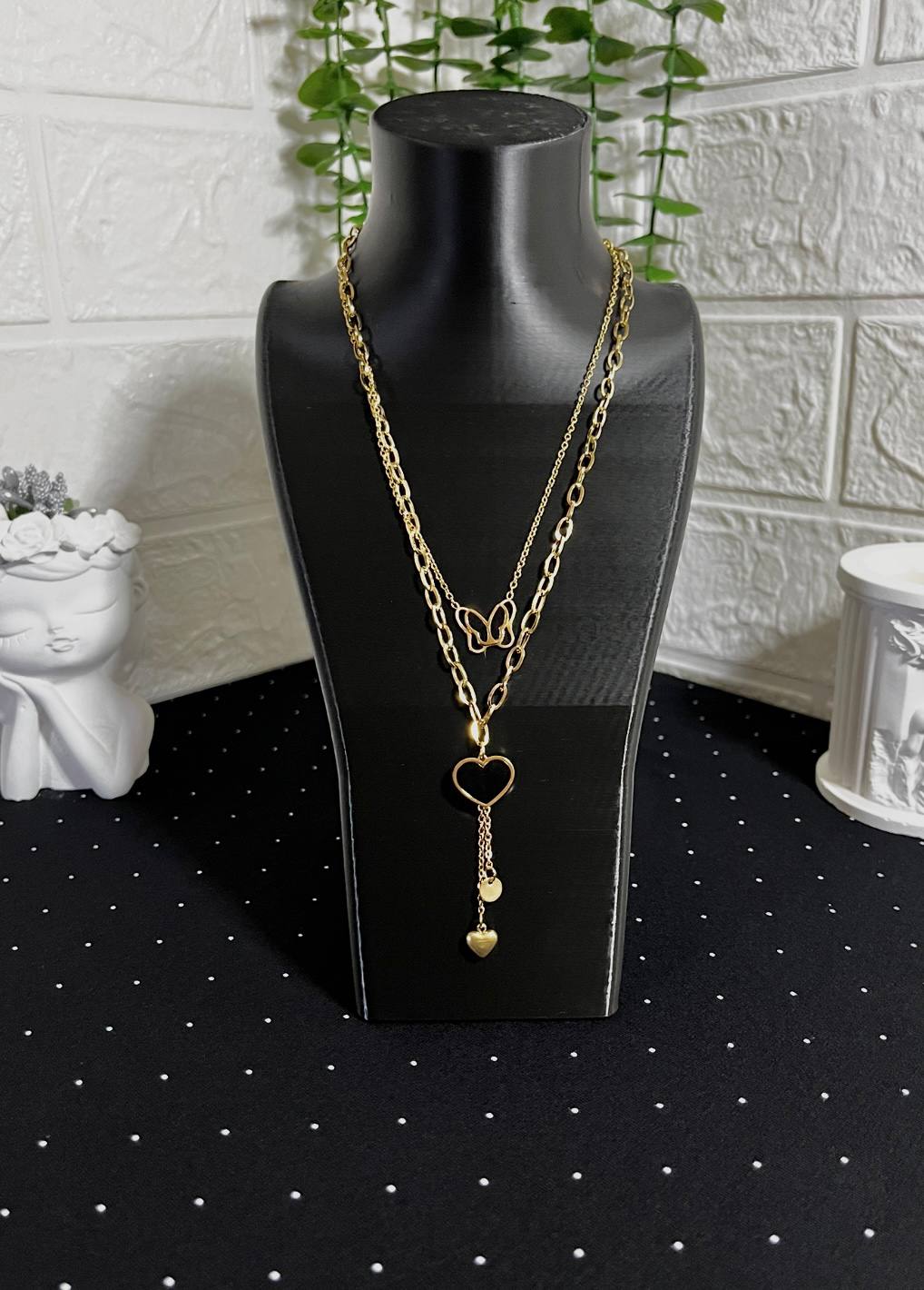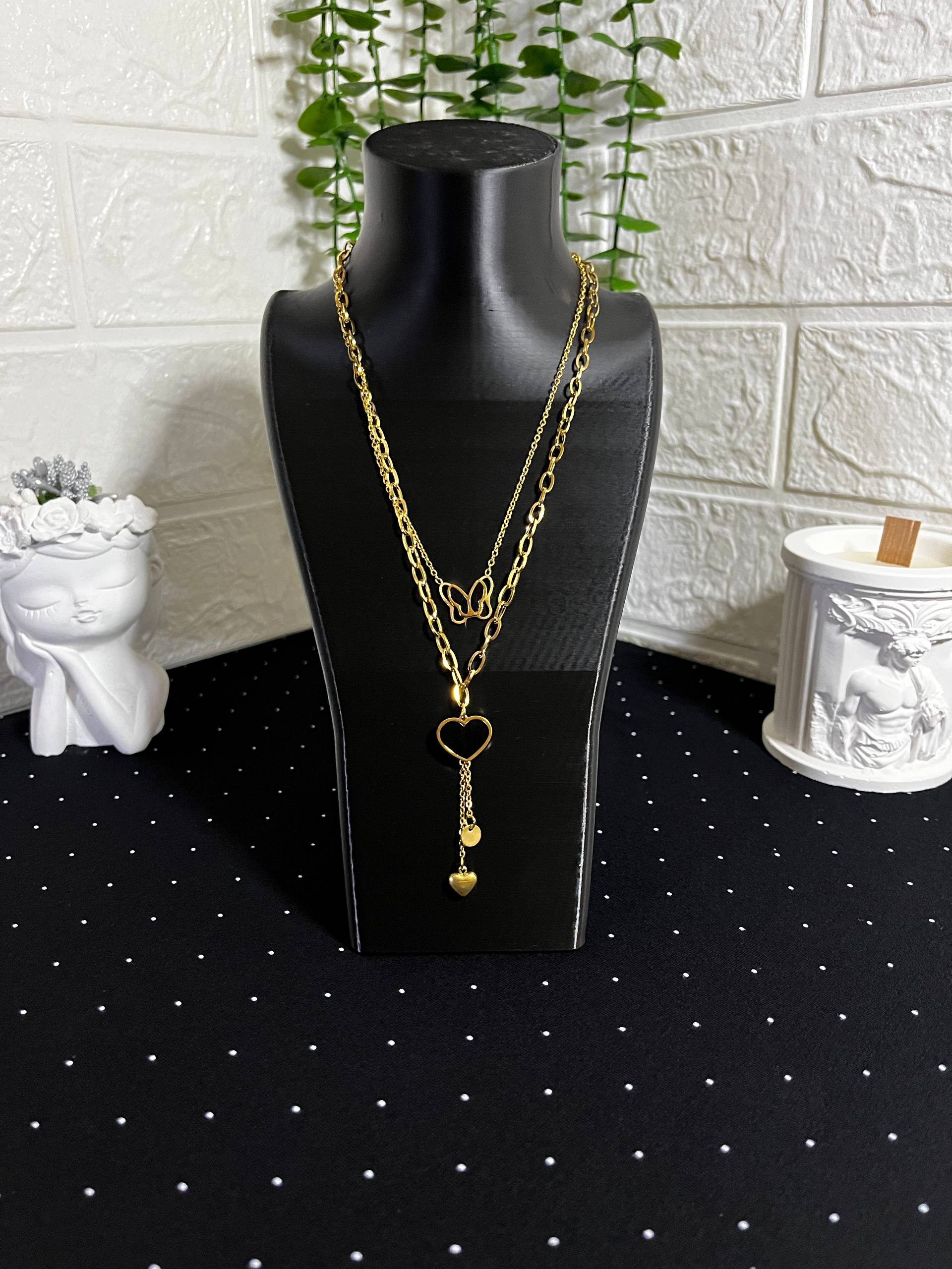 Kalp ve Kelebek Figürlü Çelik Kolye Gold